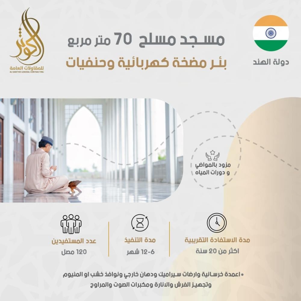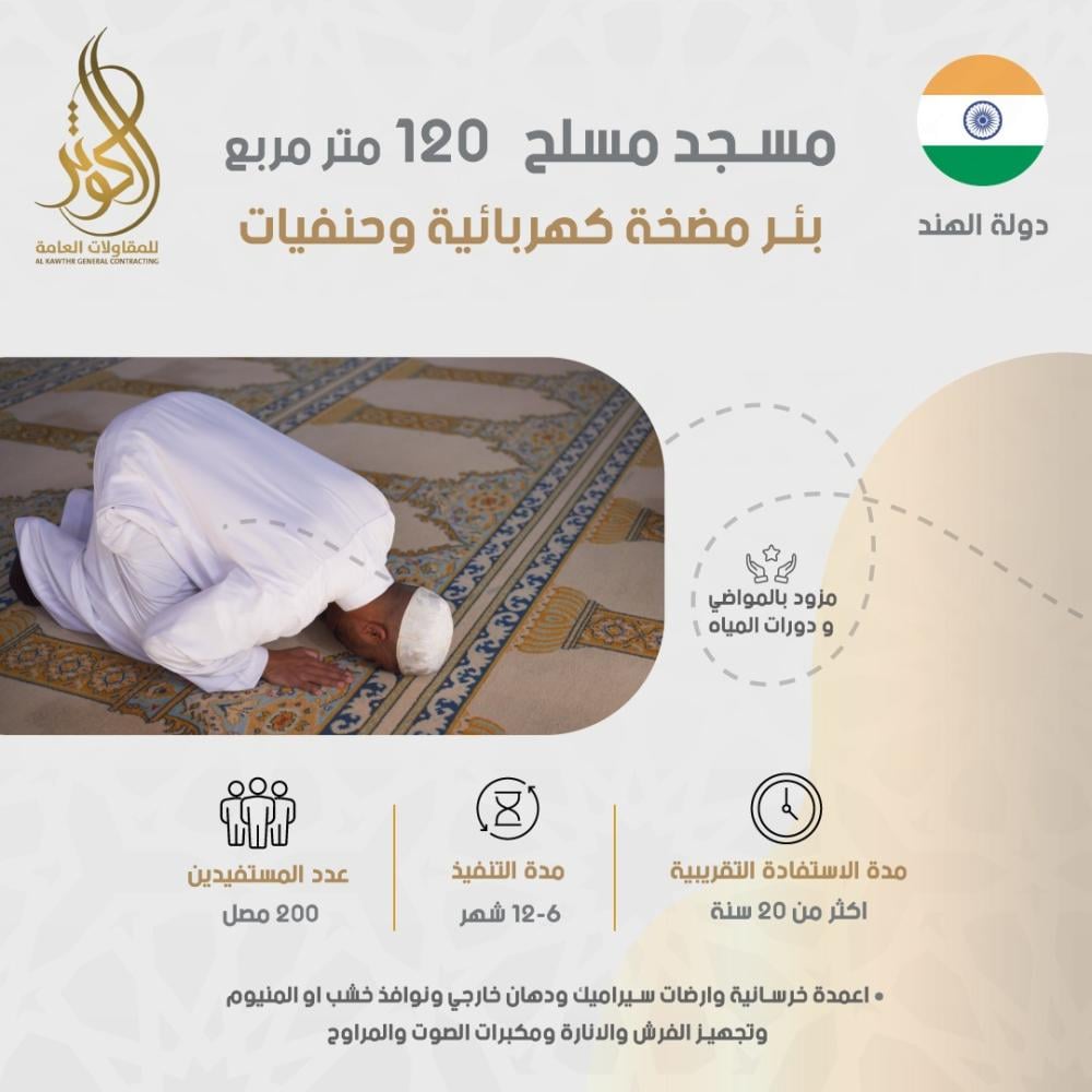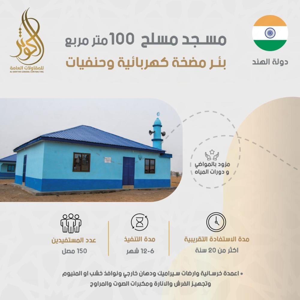 مشروع متكامل يجمع بين مسجد مسلح بمساحات متعددة، وبئر يخدم المصلين بمضخة كهربائية وحنفيات.